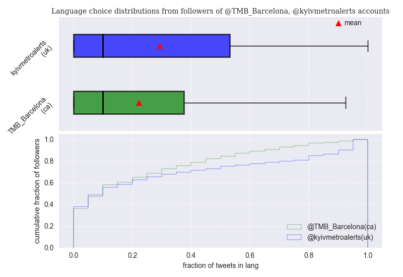 In addition, almost 30% of @kyivmetroalerts followers prefer Ukrainian to tweet as compared to less than 20% of @TMB_Barcelona followers that prefer Catalan.