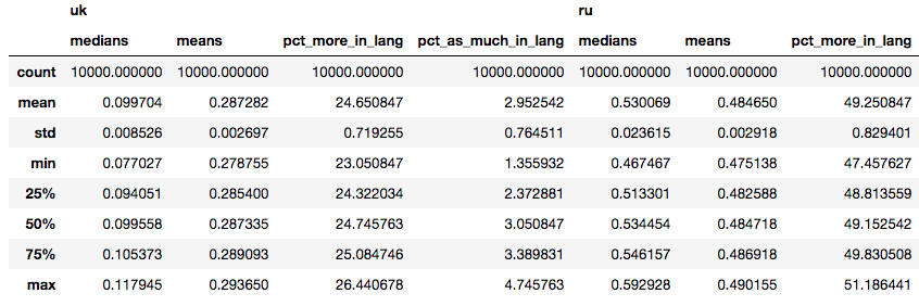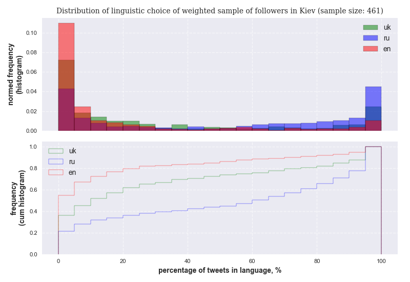If we look at the distributions of percentage of users per majority language, the proportion of users that prefer Russian is twice as big as that of users that prefer Ukrainian. The obtained result is half way between the two mentioned polls.