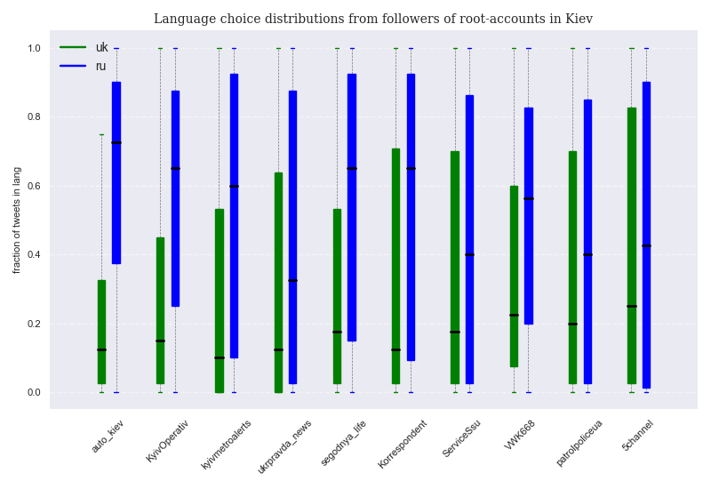 Identical criteria to those applied in the Barcelona post were used to select the list of 10 Twitter root accounts. The resulting sample has in principle a pro-Ukrainian bias that should compensate for any potential pro-Russian bias coming from primarily middle-class Twitter users. The idea is to avoid underestimation of the use of the Ukrainian language in the city.