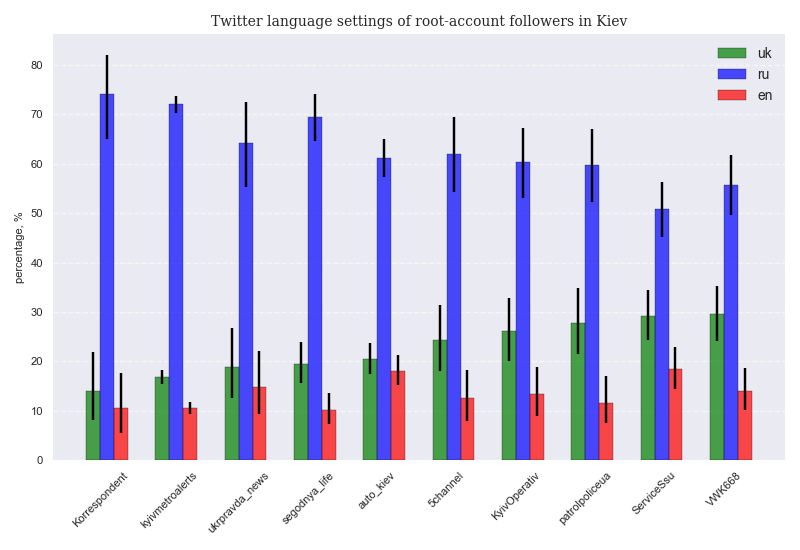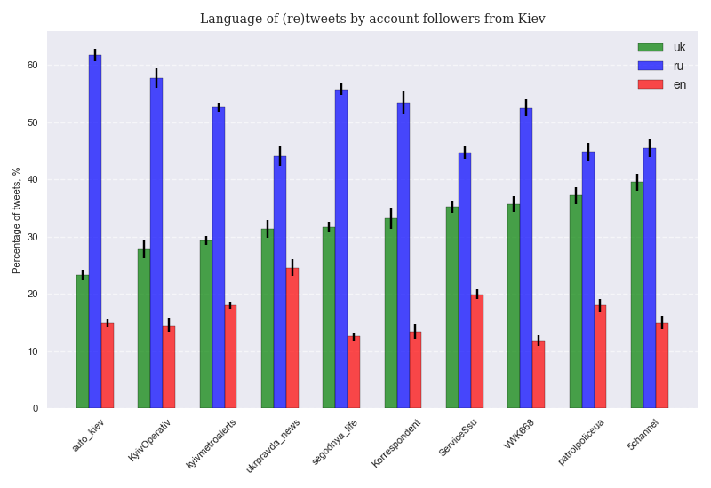 Three among the most neutral accounts have followers which mostly prefer Russian, whereas the @patrolpolice or @5channel ( owned by current president Petro Poroshenko) have followers that are much more balanced in linguistical terms. In any case, at least 45% of tweets by followers of each account are in Russian, whereas at least 20% are in Ukrainian.