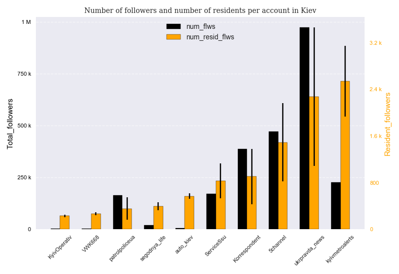 A significant difference between the Barcelona analysis and the Kiev one lies in the fact that Twitter is relatively much more popular in Barcelona than in Kiev. In Spain, Twitter is currently the 6th most popular website, whereas in Ukraine it is only the 28th. This results into a certain discordance between popular tabloids such as @segodnya (one of he most popular tabloids by distribution, approaching 1 million copies) having a relatively low number of Twitter followers ( ~ 20000 at the end of 2018) : the likely reason being that most of its readers are not frequent internet users yet. It also results in many account followers tweeting seldomly or not tweeting at all, thus making them unavailable for analysis.